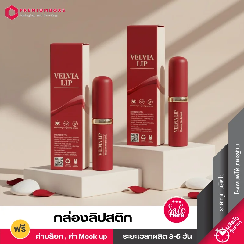 กล่องลิปสติกที่ผลิตโดยโรงพิมพ์ Premiumboxs เป็นผลงานที่มีคุณภาพสูงและมีการดีไซน์ที่โดดเด่น เรามีทีมงานออกแบบมืออาชีพที่สามารถสร้างกล่องลิปสติกของคุณให้สวยงามและมีความเป็นเอกลักษณ์ไม่เหมือนใคร โดยเราใช้เทคโนโลยีการพิมพ์ Offset และ Digital Offset เพื่อให้ได้ผลงานที่มีคุณภาพสูงในราคาที่เหมาะสม พิเศษ สั่งผลิตกล่องลิปสติก 1,000 ใบ ราคาต่อใบอยู่ที่ 4 บาทเท่านั้น (ขนาดกางออกไม่เกิน A5) ใช้ระยะเวลาการผลิตเพียง 3-5 วันเท่านั้น จ้ดส่งตรงตามเวลาให้คุณทันใช้งานกล่องลิปสติกของคุณ ติดต่อทันที ฟรี ให้คำปรึกษาก่อนสั่งผลิต