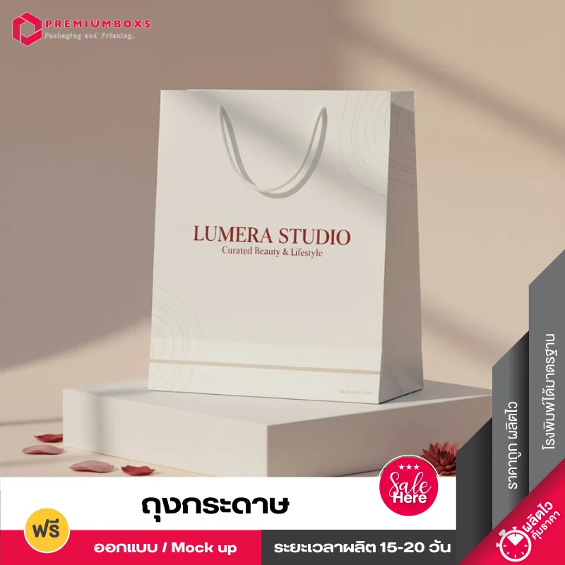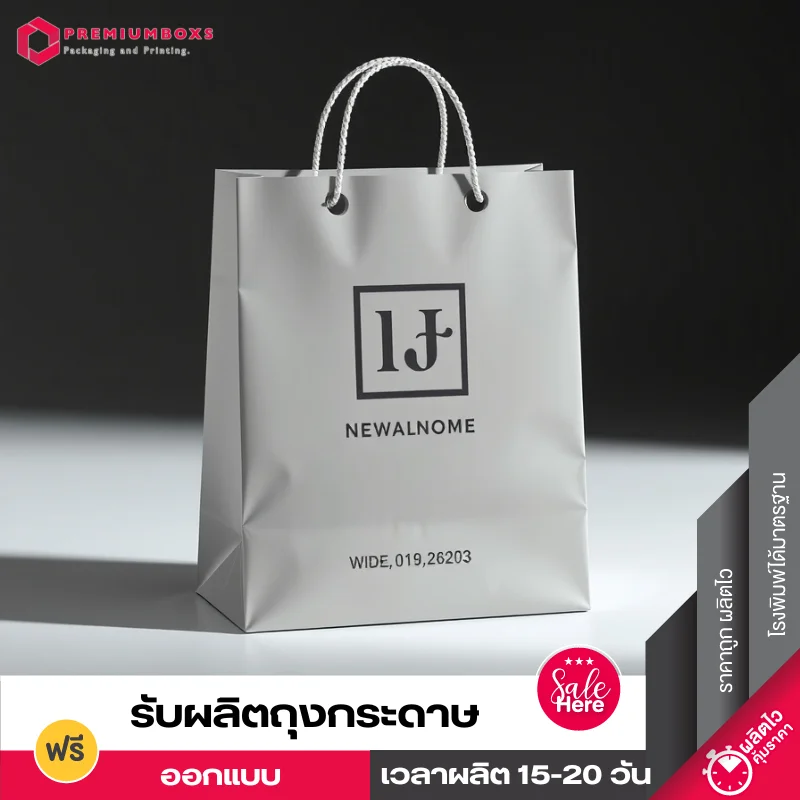 เราพร้อมรับผลิต ถุงกระดาษสำเร็จรูป ทุกรูปแบบ เช่น ถุงกระดาษช้อปปิ้ง ถุงกระดาษใส่ของขวัญ และสามารถพิมพ์โลโก้บนถุงได้โดยมีขั้นต่ำการสั่งผลิตเพียง 300 ใบ Premiumboxs เราเป็นผู้เชี่ยวชาญในการผลิตถุงกระดาษช้อปปิ้งที่เหมาะสำหรับส่งเสริมแบรนด์และผลิตภัณฑ์ของคุณ คุณสามารถสั่งผลิตถุงกระดาษและกำหนดรายละเอียดต่างๆได้ตามความต้องการของคุณ เราสามารถพิมพ์ถุงกระดาษได้รวดเร็วในระยะเวลา 15-20 วันทำการ และคุณสามารถเลือกพิมพ์บนถุงกระดาษด้วยสี 1-4 สี และแพนโทนสีต่างๆ ไม่ว่าคุณจะนำถุงกระดาษไปใช้ในงานนิทรรศการหรือประชุม ถุงกระดาษที่มีโลโก้พิมพ์จะช่วยสร้างความจดจำและเพิ่มความรับรู้ต่อแบรนด์หรือผลิตภัณฑ์ของคุณอย่างมาก ผลิตภัณฑ์ถุงกระดาษพิมพ์ที่มีคุณภาพสูงจะเป็นส่วนสำคัญในการสร้างแบรนด์และการตลาด เราเป็นผู้ผลิตถุงกระดาษที่คุณสามารถกำหนดรายละเอียดตามความต้องการของคุณได้อย่างแน่นอน